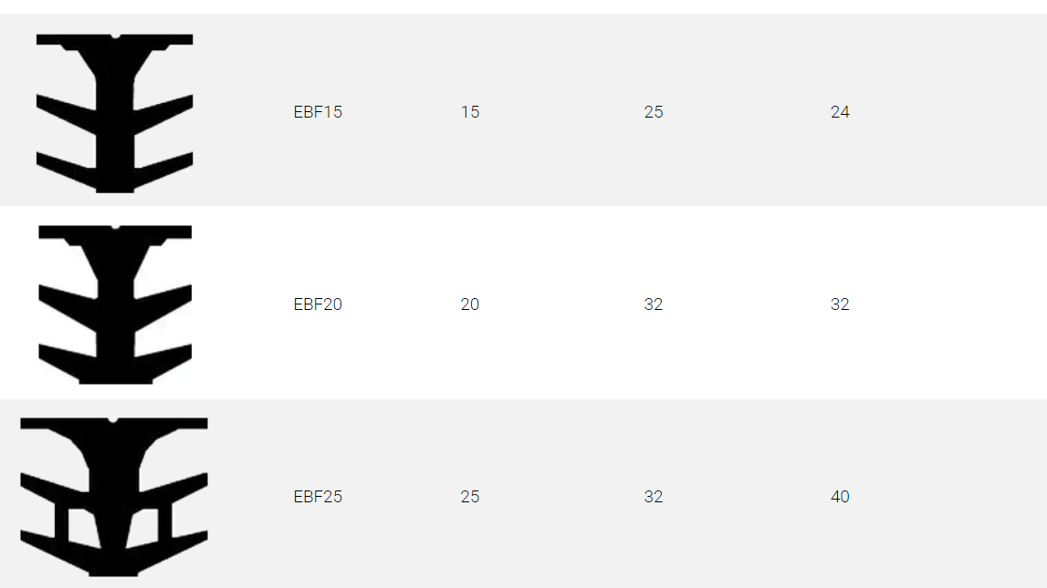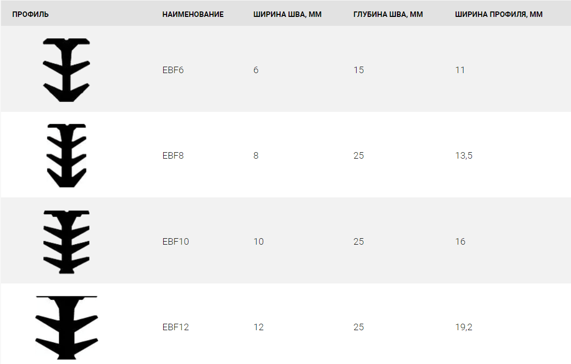 Применения уплотнительного профиля "Ёлочка" для герметизации деформационных швов Вы значительно сократите длительность строительных работ , затраты рабочей силы и средств малой механизации. Это простой и надёжный материал , лёгкий и удобный в монтаже , не требующий специальных условий и ограничений, а по своим физико-механическим характеристикам не уступает более дорогим материалам для устройства швов. Профиль поставляется в упаковках -бухтах по 50, 100, 200, 500 метров. В таблице ниже можно ознакомиться с типовыми размерами уплотнительных профилей, и определиться какой профиль подойдёт Вам в зависимости от геометрических параметров деформационных швов.