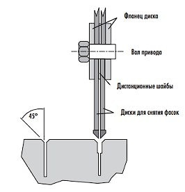 Фасочная машина очень удобна и проста в использовании за счет своих небольших габаритов и возможности сухой резки. А за счет того , что режущий вал нарезчика располагается на одной оси с передним колесом, фасочник может подстраиваться под все неровности бетонной поверхности. Неотъемлемым элементом при использования фасочной машины являются специальные фасочные диски. Клинообразная форма алмазных дисков позволяет нарезать кромку деформационного шва под углом в 45 градусов. Диски поставляются диаметром от 200 до 300 мм со стандартным посадочным диаметром 25,4 мм. Поскольку ширина швов может отличаться то для регулирования ширины используют промежуточную проставочную шайбу.